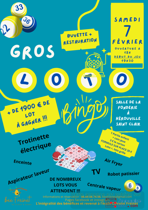 Double Loto, spécial, bon d’achat un bon d’achat de 700,01 € bon d’achat de 500 € des bons d’achat de 100 €, 80 € une magnifique tombola avec un séjour Center, parcs et écran, plat bon de carburant, bon d’achat et d’autres lots. N’hésitez pas à réserver.