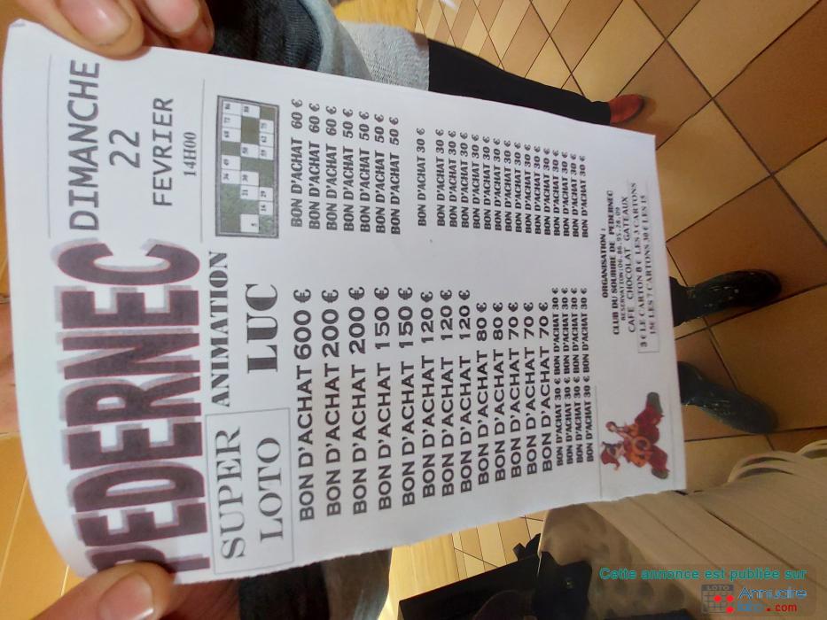 Super loto, salle des fêtes de Pedernec le dimanche 22 février 2026. 3050 € de lots en bon d'achat dont un de 600 €.