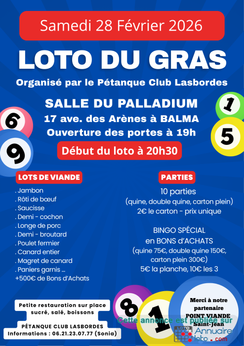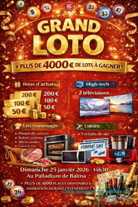 Le Balma S.C. organise un grand loto le dimanche 25 janvier 2026 à 14h30 à la Salle Le Palladium , chemin des Arènes à Balma.
