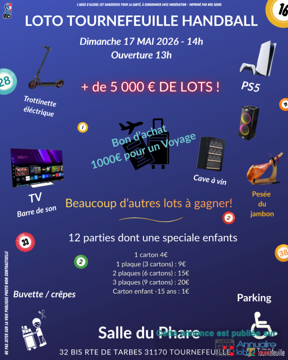 Contactez par mail avec votre numéro de téléphone L'A.S Tournefeuille Football organise son traditionnel loto le dimanche 22 Février 2026 à la salle du PHARE à Tournefeuille.