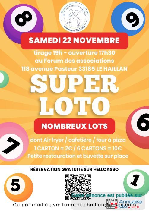Loto du club de gymnastique et trampoline du Haillan. Début à 19h.
