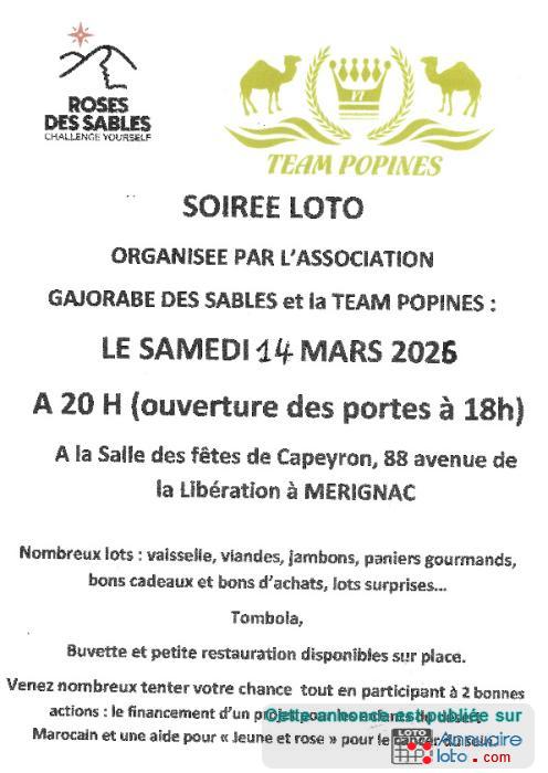 Soirée loto solidaire organisée par l'association Gajorabe des Sables. Les bénéficezs serviront à participer au financement de la construction d'une école dans le désert Marocain.