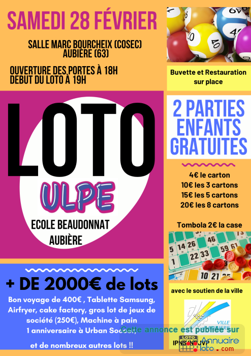 L'association des parents d'élèves ULPE de l'école Beaudonnat à Aubière organise son 3e LOTO !